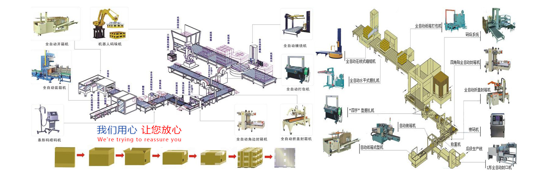 在长期累积机械设计及制造的经验下,目前我司已经有上几十种的成熟稳定的包装机械,同时研发所还在根据市场需求不断开发新的包装机械,设备涵盖卸罐(瓶)机系列、罐(瓶)膜包机系列、装箱机系列、拆码垛系列......